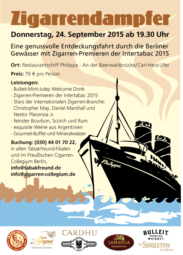 Zigarrendampfer September 2015!Eine genussvolle Entdeckungsfahrt durch die Berliner Gewässer mit Zigarren-Premieren der Intertabac 2015.