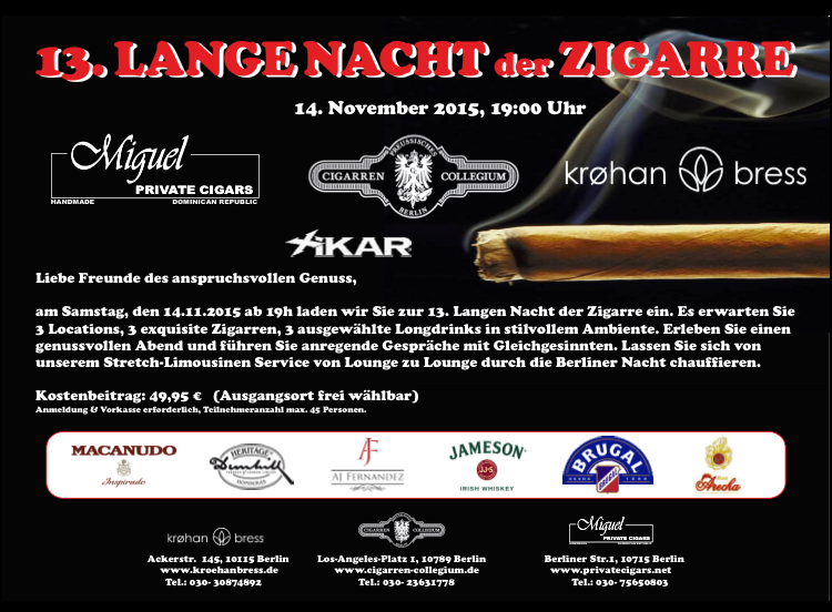 am Samstag, den 14. November 2015 ab 19 Uhr laden wir Sie zur 13. Langen Nacht der Zigarre ein. Es erwarten Sie drei Locations, drei exquisite Zigarren sowie drei ausgewählte Longdrinks in stilvollem Ambiente. Erleben Sie einen genussvollen Abend und führen Sie anregende Gespräche mit Gleichgesinnten.